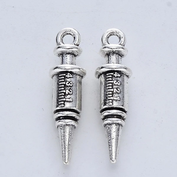 Antikolt ezüst színű fecskendő / injekciós tű fityegő/2db
