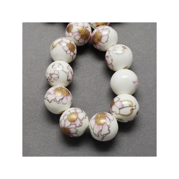 Fehér virágos golyó alakú porcelán, kerámia gyöngy (8mm)